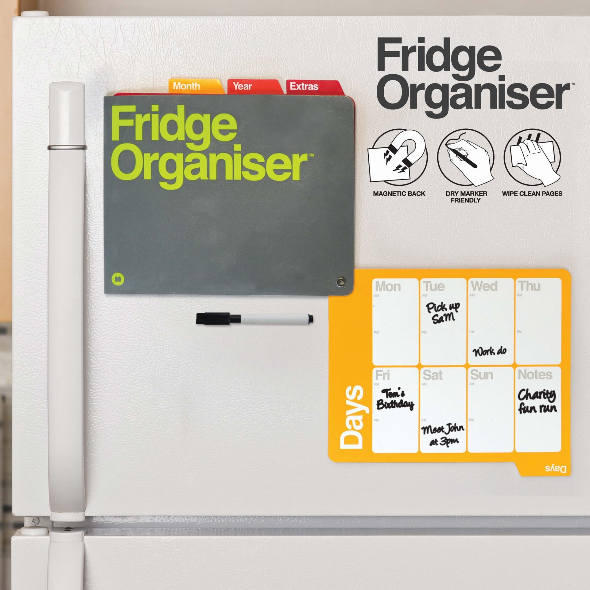 Skoroszyt złożony z tabliczek suchościeralnych z dołączonym magnetycznym pisakiem. Na powierzchni znajduje się stały nadruk terminarza, który ułatwia planowanie zadań. Przyda się w domu - jako informacja - przypominajka dla wszystkich domowników, lub w biurze jako organizer.