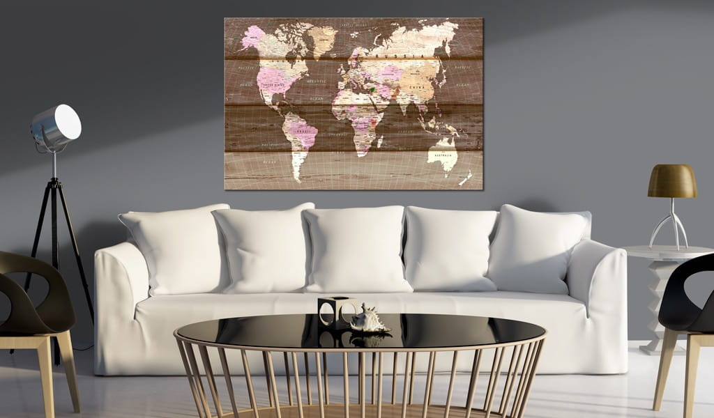 Obraz na korku "Obraz na korku - Drewniany świat [Mapa korkowa]" to produkt dla osób poszukujących oryginalnych ozdób na ścianę. Ekologiczny materiał i ciekawy wzór sprawiają, że zwykła tablica korkowa zmienia się w stylowy dodatek, który możesz wykorzystać w rozmaity sposób. Do obrazów na korku można przypinać pinezki, zaznaczać odwiedzone miejsca na mapie lub doczepiać notatki. Obraz na korku "Obraz na korku - Drewniany świat [Mapa korkowa]" jest o wiele lżejszy od tradycyjnych dekoracji ściennych. Dzięki temu ozdobne tablice korkowe mogą zawisnąć w dowolnym miejscu w Twoim mieszkaniu bądź biurze. Płótno z wydrukiem nakładane jest na płytę korkową. Dzięki temu nadruk cechuje się wyrazistymi kolorami i oddaje najdrobniejsze detale. Przypnij do niego pinezki lub notatki i stwórz swój indywidualny wzór na swojej ścianie!