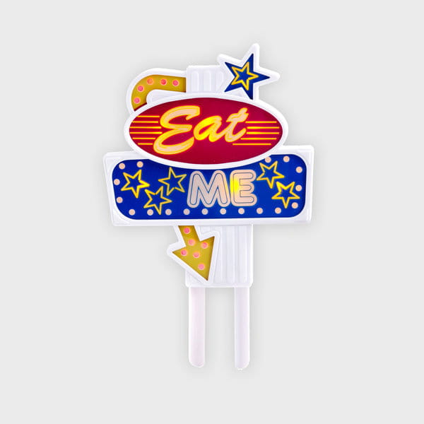 Topper w formie neonu rewelacyjnie udekoruje każde danie. Neonowa migocząca dekoracja na tort z napisem Eat me! została zaprojektowana na wzór vintage szyldu rodem z Vegas i sprawi, że tort będzie wyglądał spektakularnie.