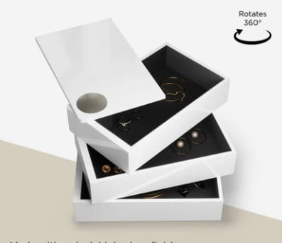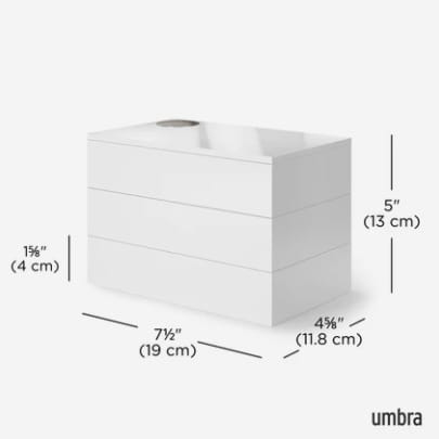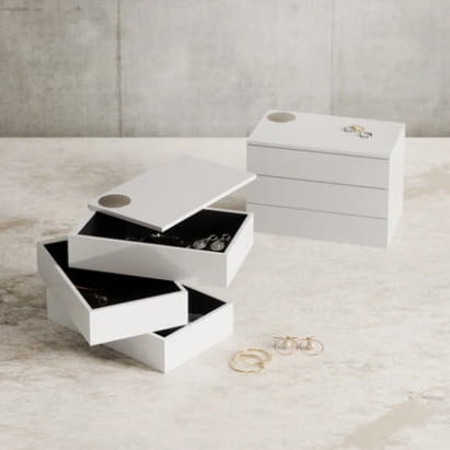 Trzy ukryte szufladki szkatułki Spindle od Umbry pozwolą przechowywać pierścionki, kolczyki, bransoletki, zegarki, naszyjniki i inne akcesoria w różnych konfiguracjach. Każda szuflada jest wyłożona miękką tkaniną, aby zapobiegać przemieszczaniu się biżuterii lub jej uszkodzeniu. Prosty, nowoczesny obrotowy mechanizm otwierania, oszczędny design, elegancja - to wszystko sprawia, że szkatułka Spindle jest idealna na prezent!