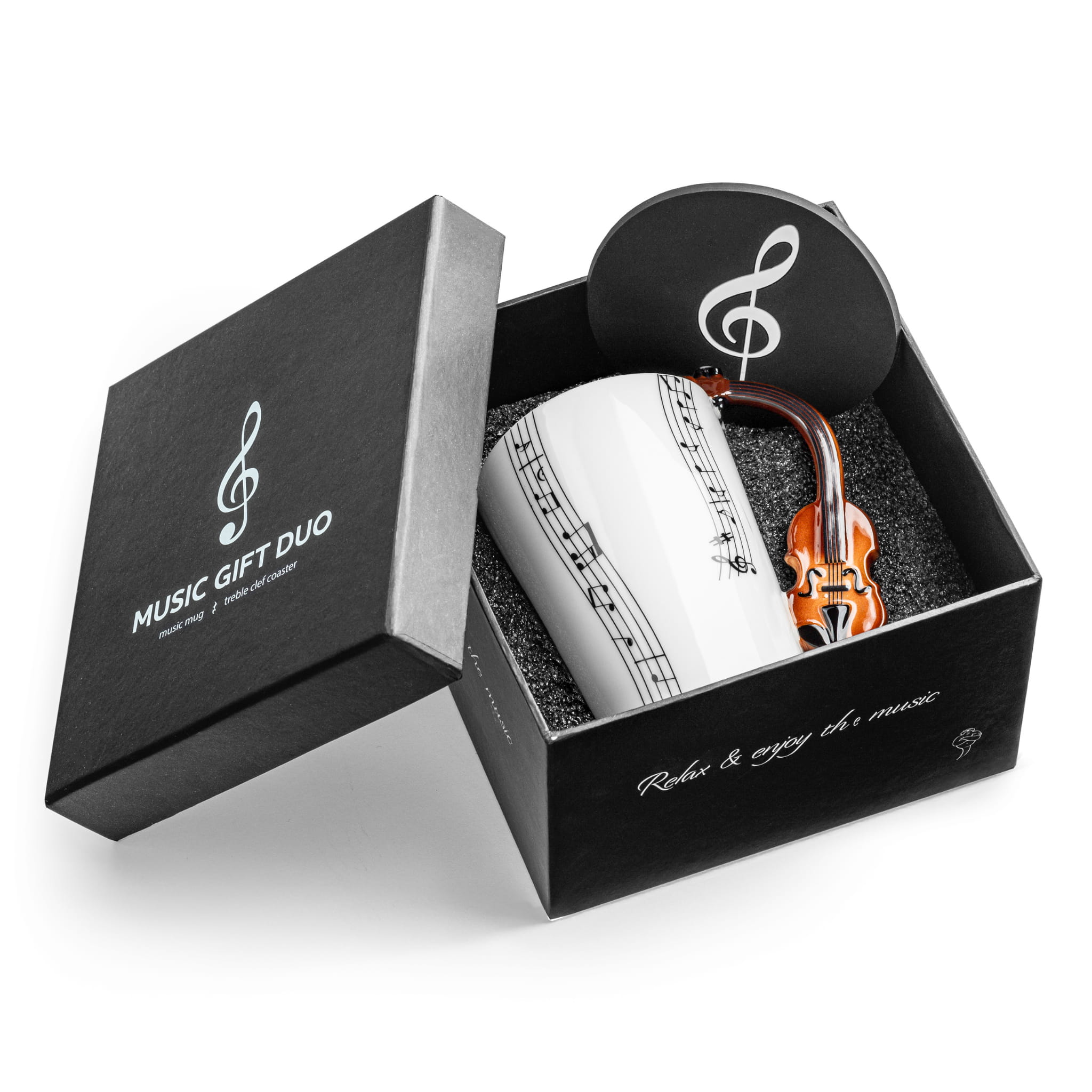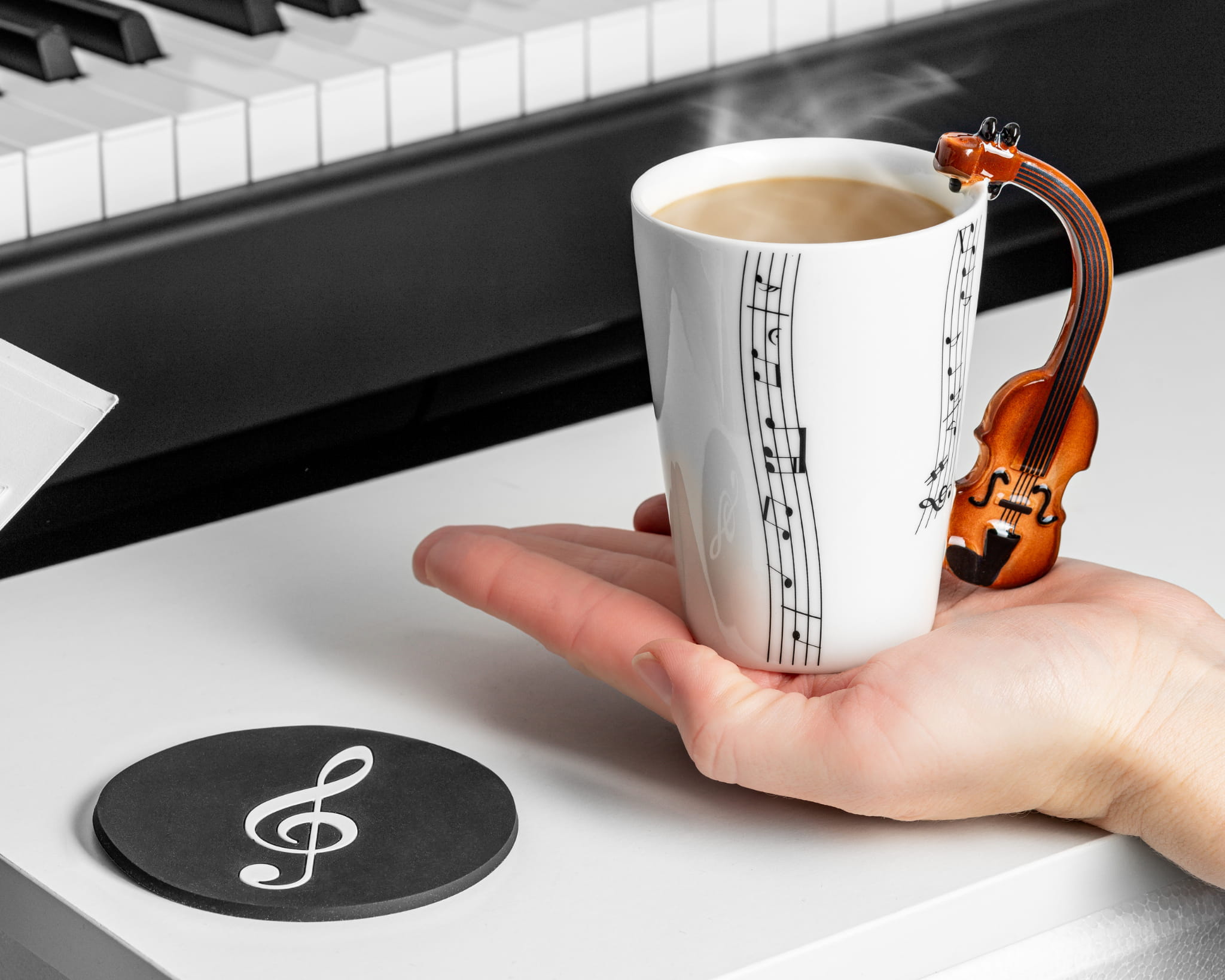 - elegancki kubek muzyka z uszkiem w kształcie skrzypiec wraz z podkładką z motywem muzycznym